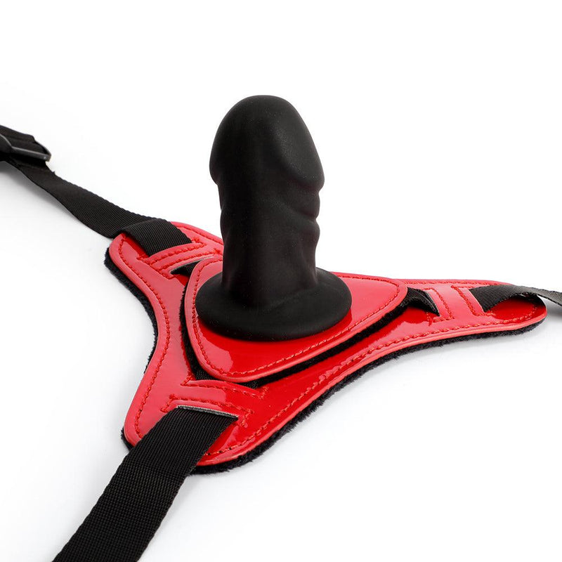 Don't miss this strapon dildo including black penis and red straps, which was created for great fun in a colorful couple's room.