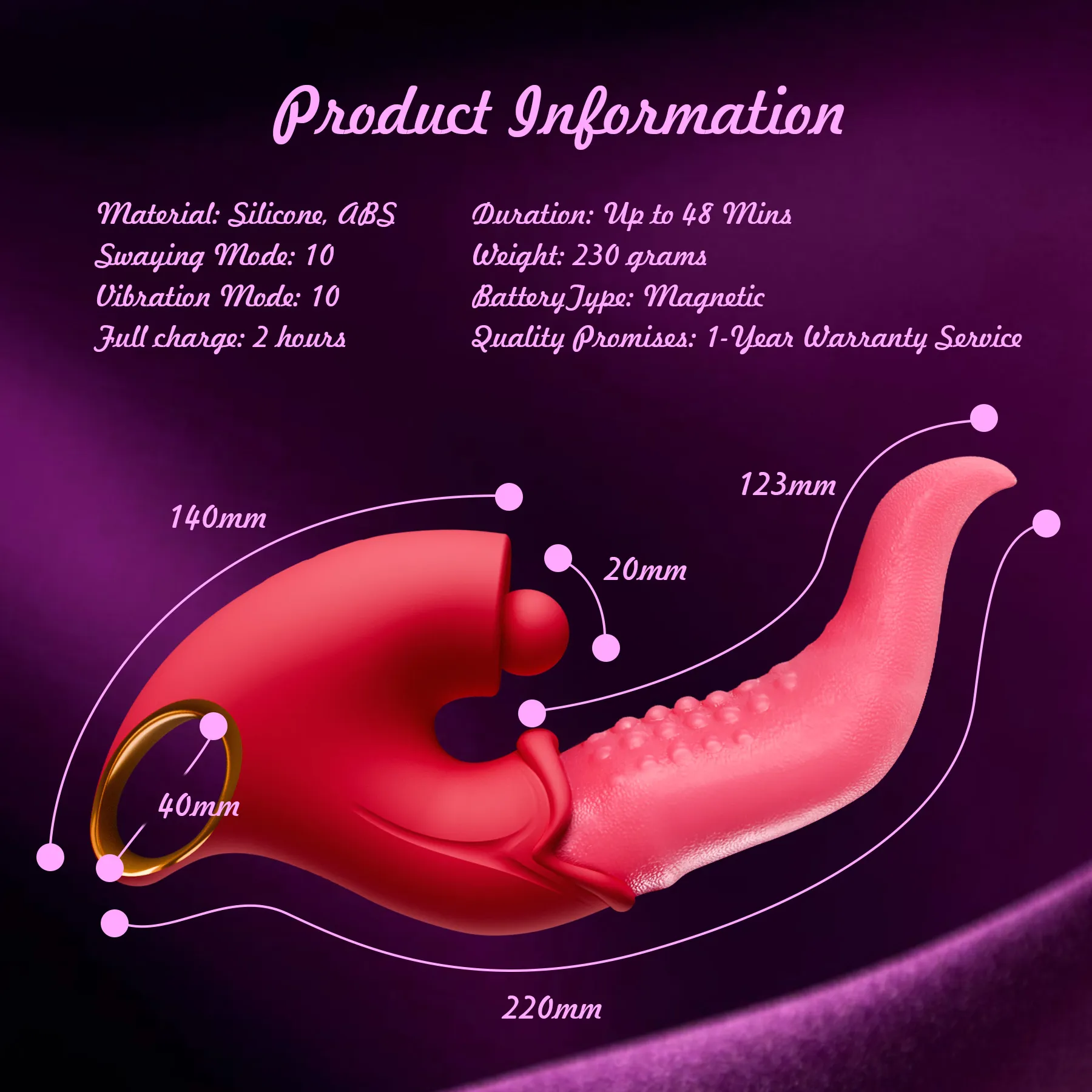 It is designed with safety as the top priority, using high-quality silicone, which is odorless and non-toxic. The magnetic USB charger prevents port damage and lets you enjoy up to 120 minutes of uninterrupted play. As a tongue vibrator designed for women, it adopts confidential packaging, which is ideal for travel and protects your privacy.