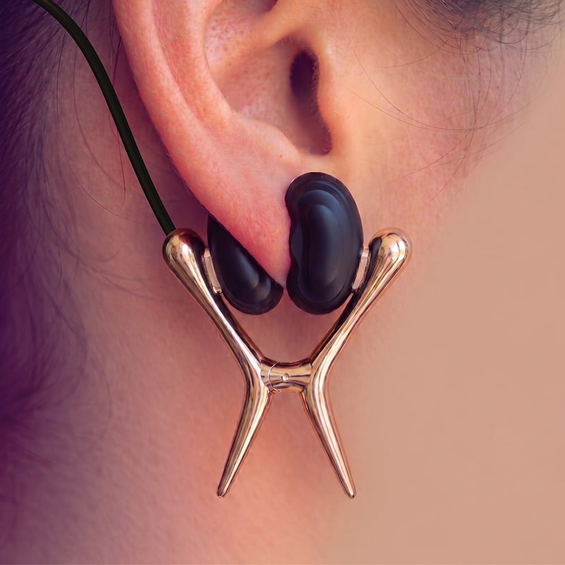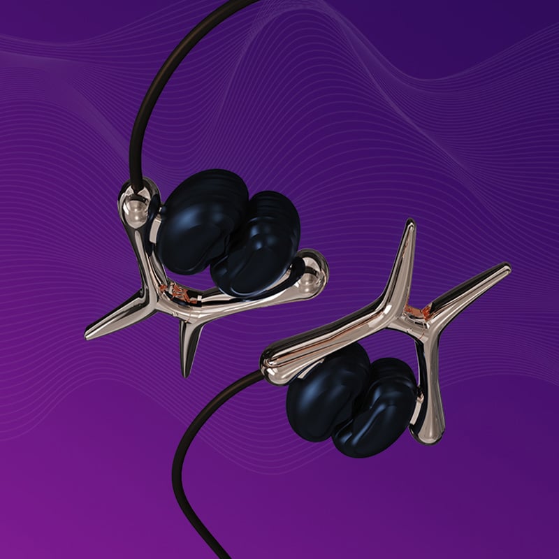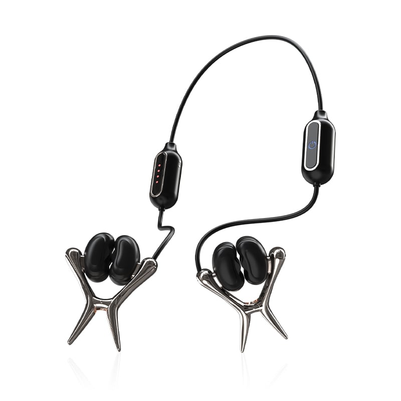 Stylish, elastic compliant device with soft silicone clamp heads. Stays in place while you move, letting you enjoy pressure without pricking the skin.