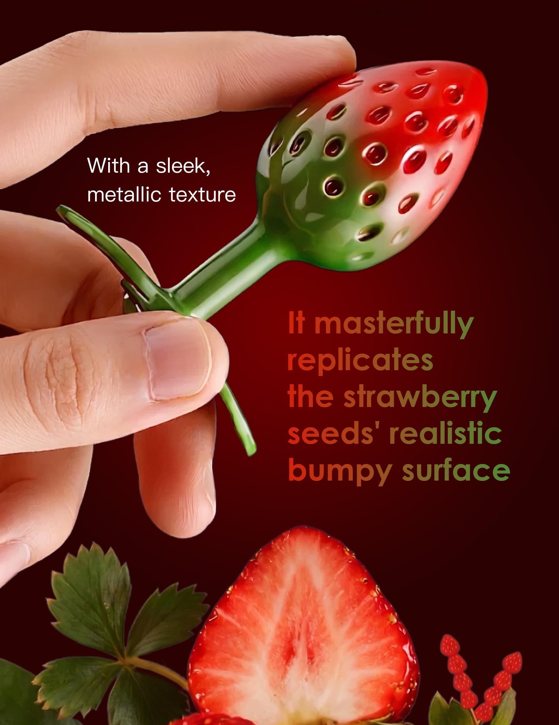 Its captivating strawberry shape, the realistic, granular, uneven texture will make you wonder if it’s even a real fruit, so pretty and such eye candy.