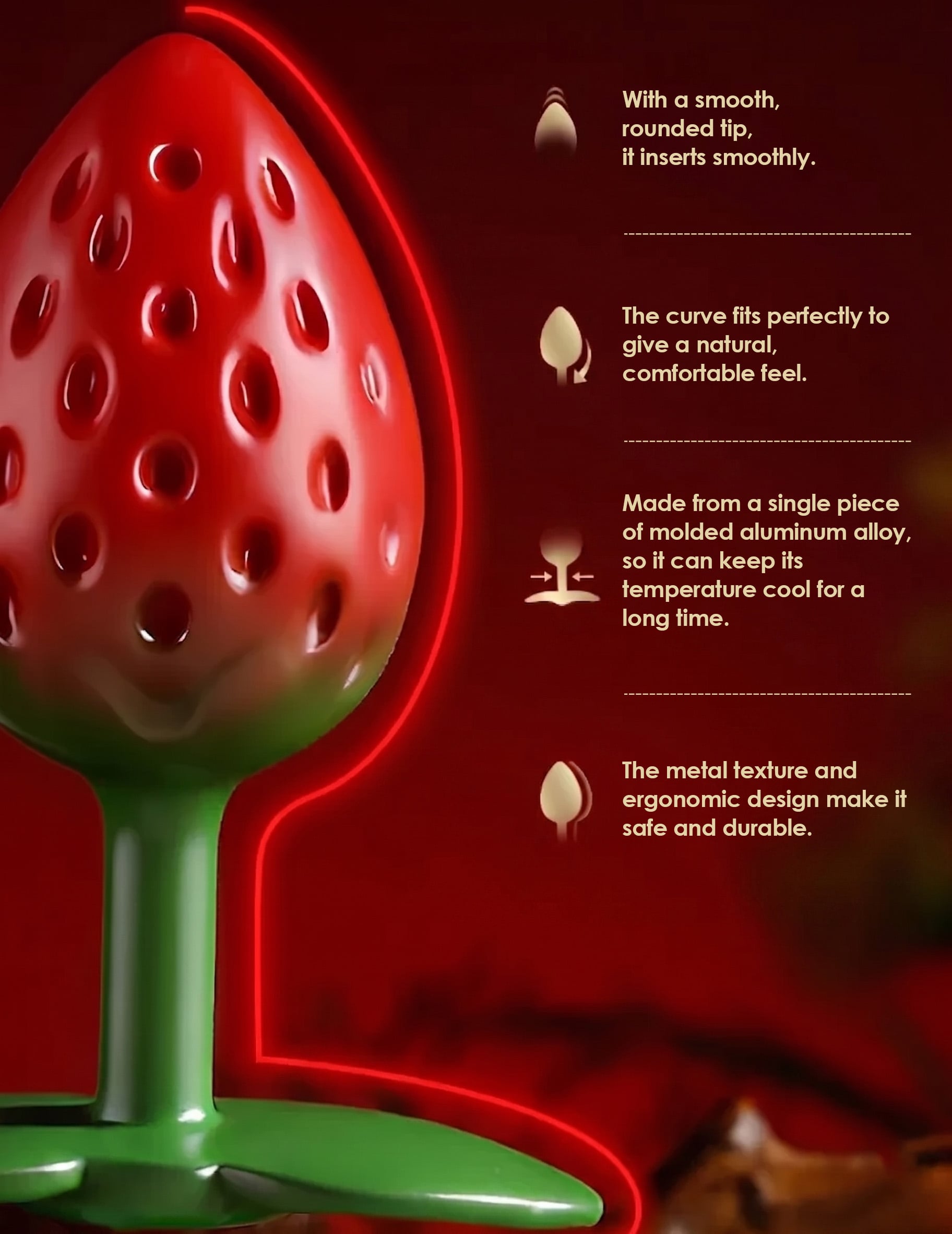 The smooth, rounded tip is made to glide in effortlessly using lube, while the strawberry curves can give you that tight, comfortable snug to make you feel full and satisfied.